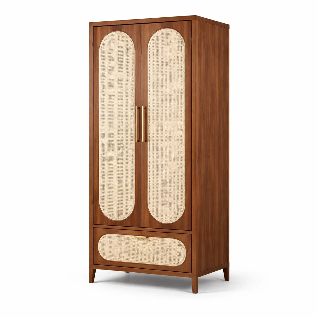 Armoire en bois avec portes en cannage et tiroir