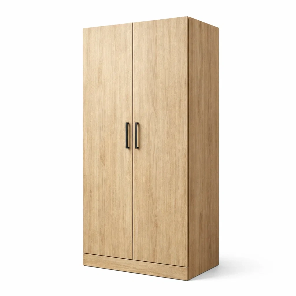 Armoire en bois clair avec 2 portes et poignées en métal